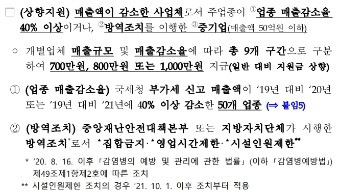 코로나 방역조치 기간 중 매출액이 감소한 사업체, 즉 집합금지, 영업제한, 시설인원제한 조치를 이행한 사업체는 매출감소가 되지 않더라도 600만원을 지급합니다. 그리고 개별업체 매출 규모 및 매출감소율에 따라서 총 9개 구간으로 구분해서 60만원~800만원 지급됩니다.