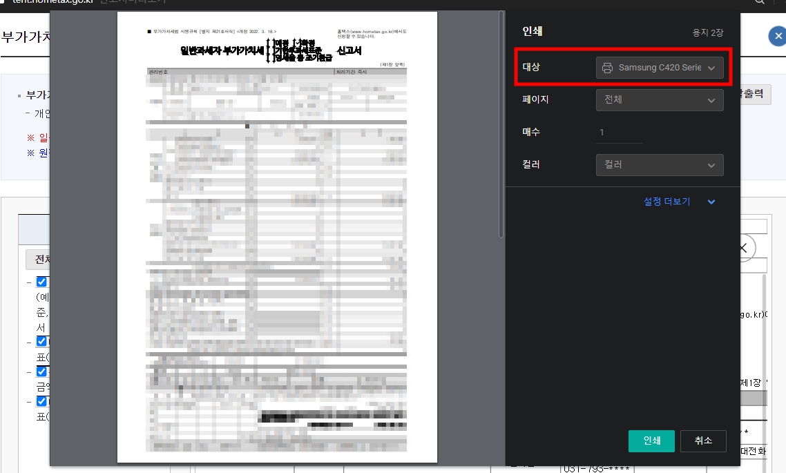 접수 번호를 클릭하면 다음과 같이 부가가치세 확정신고서 내역을 확인할 수 있습니다. 인쇄 모양 버튼을 클릭합니다. 그리고 팝업으로 인쇄 방식이 나오면 인쇄를 클릭합니다.